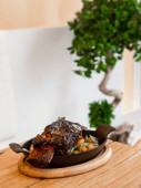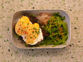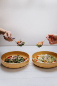 Śródziemnomorska miska ze świeżymi pomidorami, ogórkiem, kostkami sera i ziarnami, zdrowa restauracja Fotografia żywności z rękami trzymającymi miskę, widok z przodu.