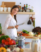 Młoda kobieta jedzenie sałatka i trzymając mix sałat