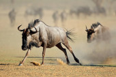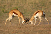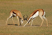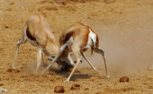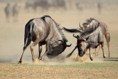 Walka dwóch męskich antylop czerwonobrzuchych (Alcelaphus buselaphus), pustynia Kalahari, Republika Południowej Afryki