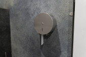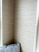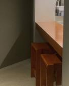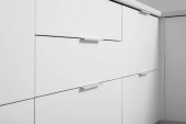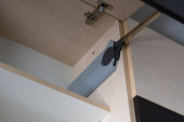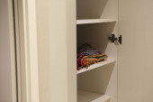 Płaszcz wisi na hakach w minimalnej przestrzeni z lekkimi ścianami i szafą. Ustawienie pokazuje prosty projekt w pomieszczeniu.