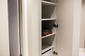Zdjęcie "Płaszcz wisi na hakach w minimalnej przestrzeni z lekkimi ścianami i szafą. Ustawienie pokazuje prosty projekt w pomieszczeniu." może być wykorzystywane do celów osobistych i komercyjnych zgodnie z warunkami zakupionej licencji Royalty-free. Obraz jest dostępny do pobrania w jakości wysokiej rozdzielczości do 5760x3840.