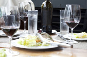 Scena resztek jedzenia i brudnych potraw po imprezie, z pustymi kieliszkami i talerzami do wina, uchwycającymi istotę pouroczystego posprzątania i doświadczenia kulinarnego