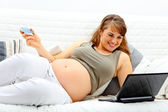 przesłuchanie dobre wieści piękne ciąży kobieta siedziała na divan