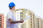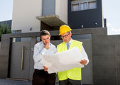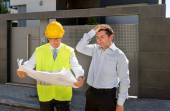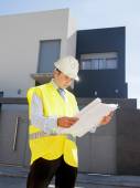 foreman worker in stress supervising building blueprints outdoors wearing construction helmet