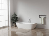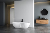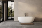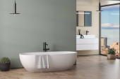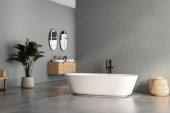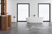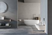 Nowoczesne minimalistyczne wnętrze łazienki z umywalką, toaletą ścienną, bidetem i wolnostojącą wanną, renderowaniem 3D