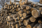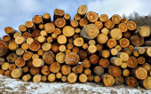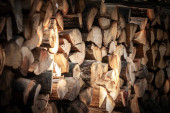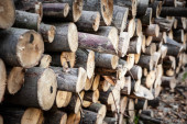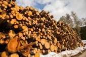 Bliski widok ułożonych kłód drewna opałowego gotowych do podgrzewania, z teksturowanymi końcami drewna i pierścieniami drzew w stosie drewna wykorzystywanym jako odnawialne paliwo zimowe i zasilanie obszarów wiejskich w energię.