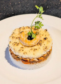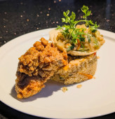Stek Salisbury zwieńczony grzybami i sosem cebulowym podawany nad kremowymi tłuczonymi ziemniakami z zielonym groszkiem i siekaną pietruszką.