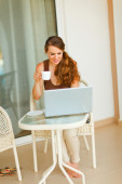 kobieta uśmiechający się siedząc na tarasie z laptopa i filiżankę herbaty i