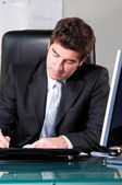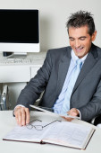 uśmiechający się biznesmen dając schowka i długopis do podpisywania