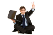 zadowolony, młody biznesmen, Wyświetlono gest zwycięstwa