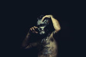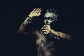 Nagi mężczyzna z trąb hełmu wojownika