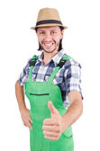 Młody wesoły ogrodnik z podlewaniem może izolować się na białym