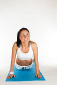 uśmiechający się piękna kobieta w ciąży co gimnastyka w domu