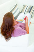 ciężarna kobieta siedzi na kanapie z słoik ogórków w ręce. zbliżenie.