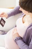 kobieta w ciąży na kanapie i szukam echa. szczelnie-do góry.