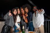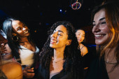 Zróżnicowani młodzi ludzie cieszą się żywym nocnym przyjęciem w klubie, śmiejąc się, pijąc koktajle i tańcząc pod niebieskimi światłami atmosfery, świętując przyjaźń i zabawę