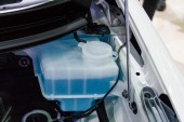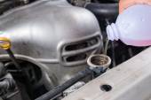 Indywidualne wlewanie fioletowego płynu do zbiornika płynu chłodzącego silnika, prezentowanie elementów silnika i narzędzi konserwacyjnych w środowisku garażowym