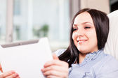 portret szczęśliwy młoda brunetka kobiety prowadzące księgę siedzi