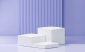 3d renderowane obiekty, 3 sześciokątne podium z Rebeccą fioletowy kolor, kolor wczesnego ptaka jako tło