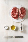 Zdjęcie "Chuck przetargu stek jest umieszczony na desce do cięcia marmuru gotowy do gotowania. Sól, pieprz i zioła są w pobliżu dla przypraw. Zapewnia to zdrową opcję posiłku." może być wykorzystywane do celów osobistych i komercyjnych zgodnie z warunkami zakupionej licencji Royalty-free. Obraz jest dostępny do pobrania w jakości wysokiej rozdzielczości do 5760x3840.