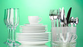 czyste talerze, kielichy, szklanki, sztućce na zielonym tle