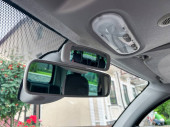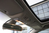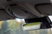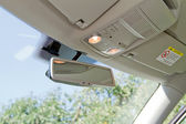 Konsola i lusterko wsteczne są widoczne wewnątrz zaparkowanego samochodu. Światło wchodzi do samochodu, pokazując część dzielnicy mieszkalnej na zewnątrz z niektórych budynków.