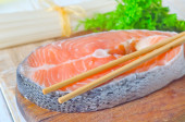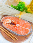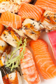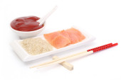 dań kuchni azjatyckiej - ryżu, łososiem i sosem sojowym