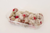 Forma surowego mięsa drobiowego w plastikowym pojemniku, izolowana na białym tle