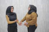 Azjatycka muzułmańska matka w hidżabie pomaga swojej młodej córce przygotować się do szkoły, pielęgnując i naprawiając jej włosy, poranną rutynę i koncepcję rodzicielstwa