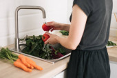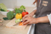 Świeże warzywa siekany w nowoczesnej kuchni, wyposażony w jasne kolory i skupić się na zdrowym stylu życia gotowania i przygotowania posiłków technik