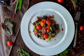 Talerz z kolorową sałatką i oliwkami na białym stole, zielony wystrój akcenty. Jasne światło podkreśla świeże składniki, tworząc żywą atmosferę jadalną
