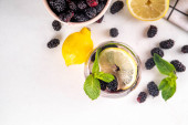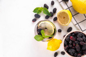 Morwowa lemoniada lub koktajl mojito, zimny mrożony orzeźwiający letni napój z cytryną, miętą i mnóstwem świeżych jagód morwy