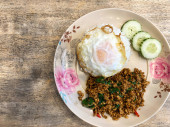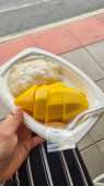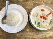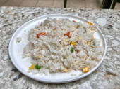 Aloo Poha serwowane w czarnej płycie, pokazując żółty spłaszczony ryż ozdobiony ziołami i przyprawami, wewnątrz przezroczystej gablocie w kawiarni