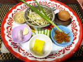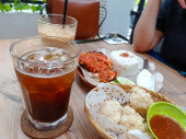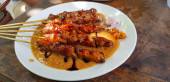Grillowane szaszłyki z kurczaka umieszczone na papierowym talerzu z małą filiżanką sosu do zanurzania i zielonym napojem na stole na tętniącym życiem targu na świeżym powietrzu