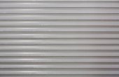 Białe drzwi garażowe są pokazane z poziomymi liniami i gładką powierzchnią. Światło tworzy cienie, które podkreślają fakturę drzwi. Dzień wydaje się być słoneczny bez chmur..