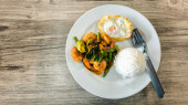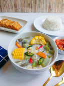 Zupa kokosowa tom yum prezentowana w misce obok porcji białego ryżu na okrągłym talerzu, z łyżką spoczywającą obok ryżu na drewnianej powierzchni