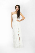 Sexy kobieta piękna pani sobie białą suknię młodej na białym tle