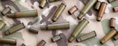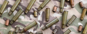 Duża ilość pocisków z pocisków karabinów szturmowych na starej tkaninie kamuflażowej. Wojna i koncepcja wojskowa