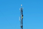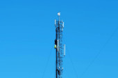 Dwóch robotników na wieży komórkowej. Wysoka wysokość działa. Personel techniczny w pracy. Wieża komórkowa na niebieskim tle. Remonterzy obsługują wieżę komórkową, instalują nowy sprzęt
