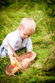 Mały chłopiec z koszem jabłek w parku