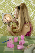 kobieta moda blond z kapelusz w barokowym złote lustro