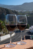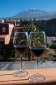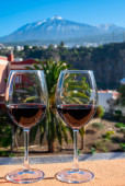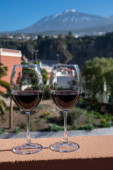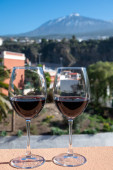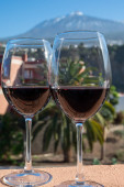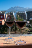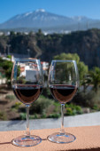 Degustacja czerwonego wytrawnego wina produkowanego w regionach winiarskich Tacoronte-Acentejo i Ycoden na Teneryfie z widokiem na szczyt wulkanu Mount Teide, zimowe wakacje w Hiszpanii