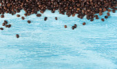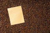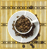 Kubek kropkowany stojąc na ziarna kawy. Rozmycie, widok z góry, o ostrości