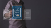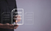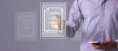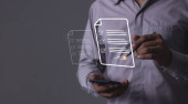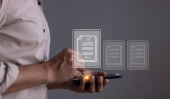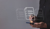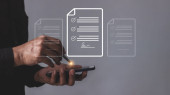 Młody człowiek z mobilną ręką smartfona za pomocą pióra dotykając do podpisania Online Business Contract, Podpis elektroniczny, Podpisanie umowy, Dokumenty cyfrowe, Przyszłość inteligentny kontrakt
