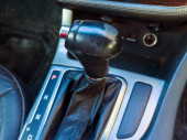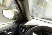 Samochód jest zaparkowany z osłoną przeciwsłoneczną opuszczoną, aby zablokować światło słoneczne. Wnętrze pokazuje deskę rozdzielczą i lusterko wsteczne. Światło dzienne jest jasne, podkreślając cechy wewnątrz samochodu.