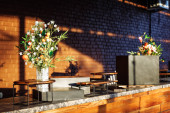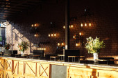 Zdjęcie "Przestronny blat na dachu, wykonany z drewna odzyskanego, z geometrycznymi wzorami, zwieńczony marmurem, oświetlony wiszącymi lampkami strunowymi Edisona i kinkietami ściennymi przylegającymi do odsłoniętych ceglanych ścian." może być wykorzystywane do celów osobistych i komercyjnych zgodnie z warunkami zakupionej licencji Royalty-free. Obraz jest dostępny do pobrania w jakości wysokiej rozdzielczości do 5760x3840.
