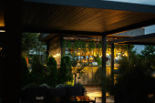 Przestronny blat na dachu, wykonany z drewna odzyskanego, z geometrycznymi wzorami, zwieńczony marmurem, oświetlony wiszącymi lampkami strunowymi Edisona i kinkietami ściennymi przylegającymi do odsłoniętych ceglanych ścian.