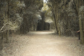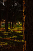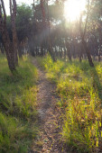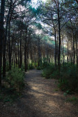 Kręta droga przez las sosnowy o złotej godzinie Logrono Hiszpania