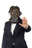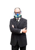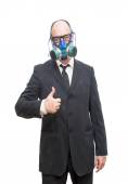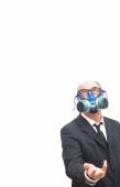 Biznesmen z maska gazowa, czekając na coś wypada powyżej