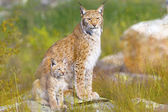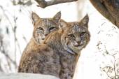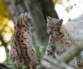 Dorosła samica rysia iberyjskiego z córką na swoim terytorium w śródziemnomorskim lesie w ostatnim świetle zimowego wieczoru